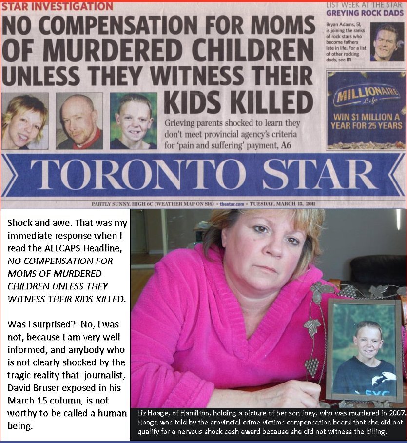 Background Report: The provincial Criminal Injuries Compensation Board was set up to help victims of violent crime and their families with payouts for psychological trauma, funeral costs and other expenses. Liz Hoage is one of these victims. Her 16-year-old son Joey was stabbed to death and he was pronounced dead at a Barrie hospital.